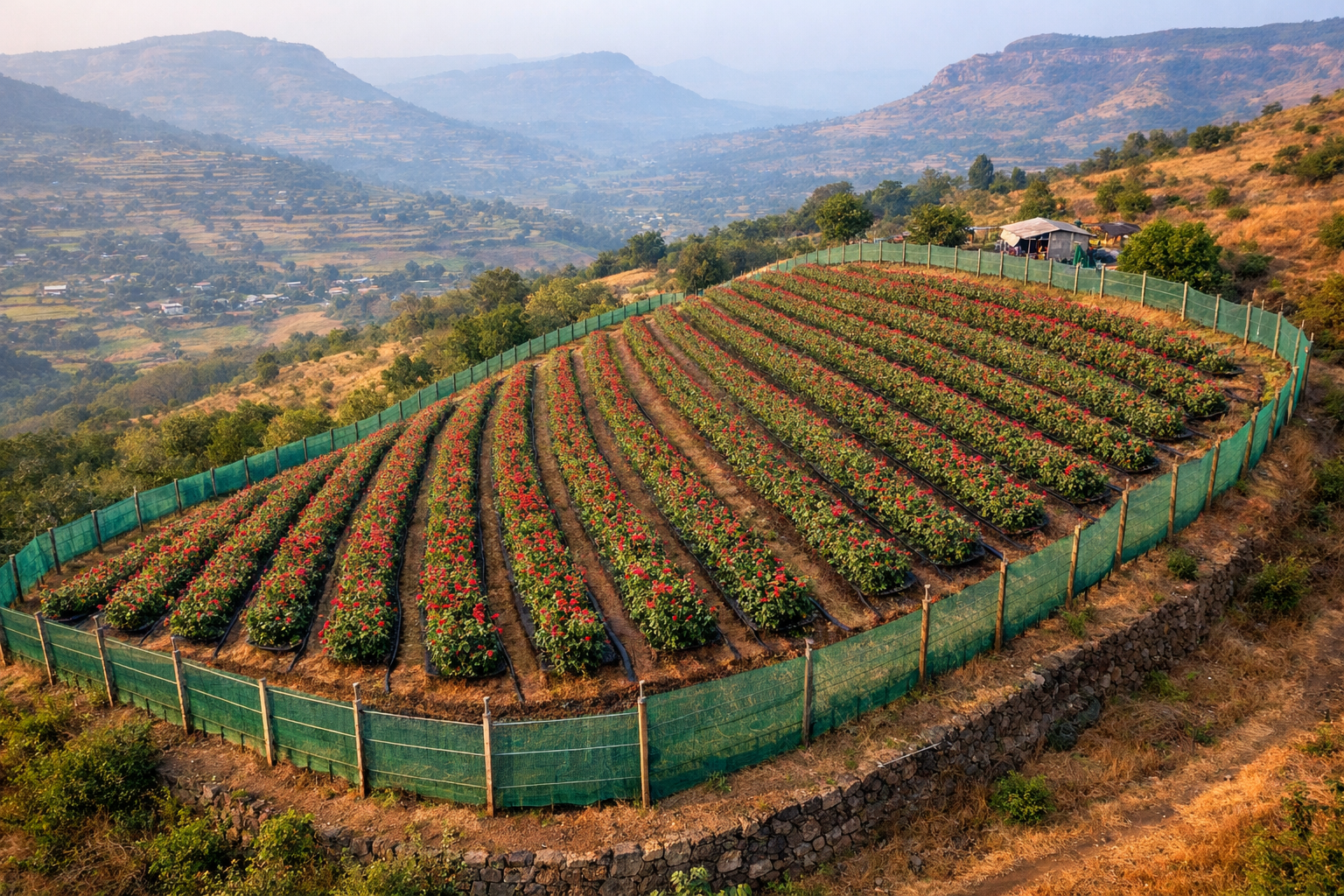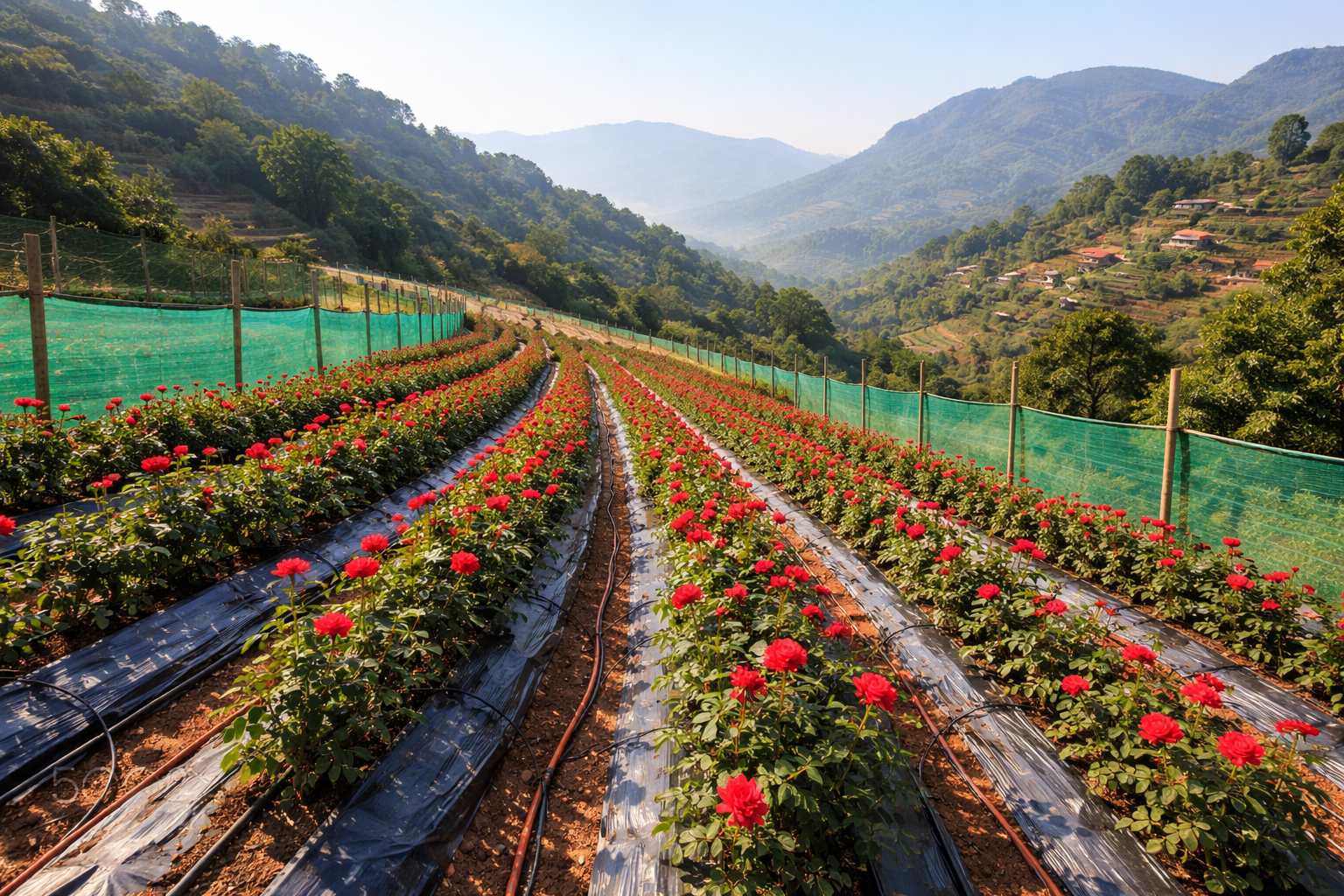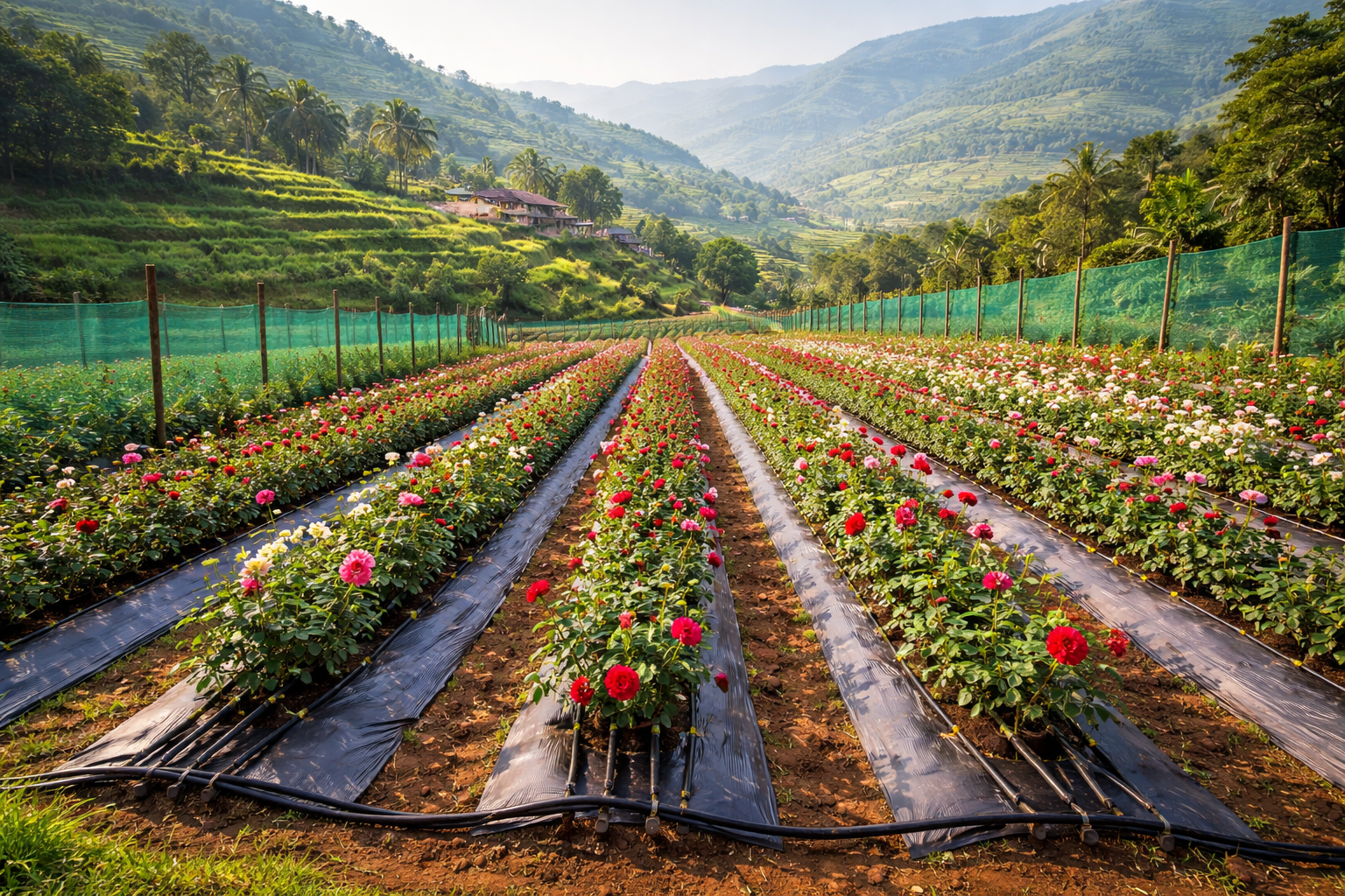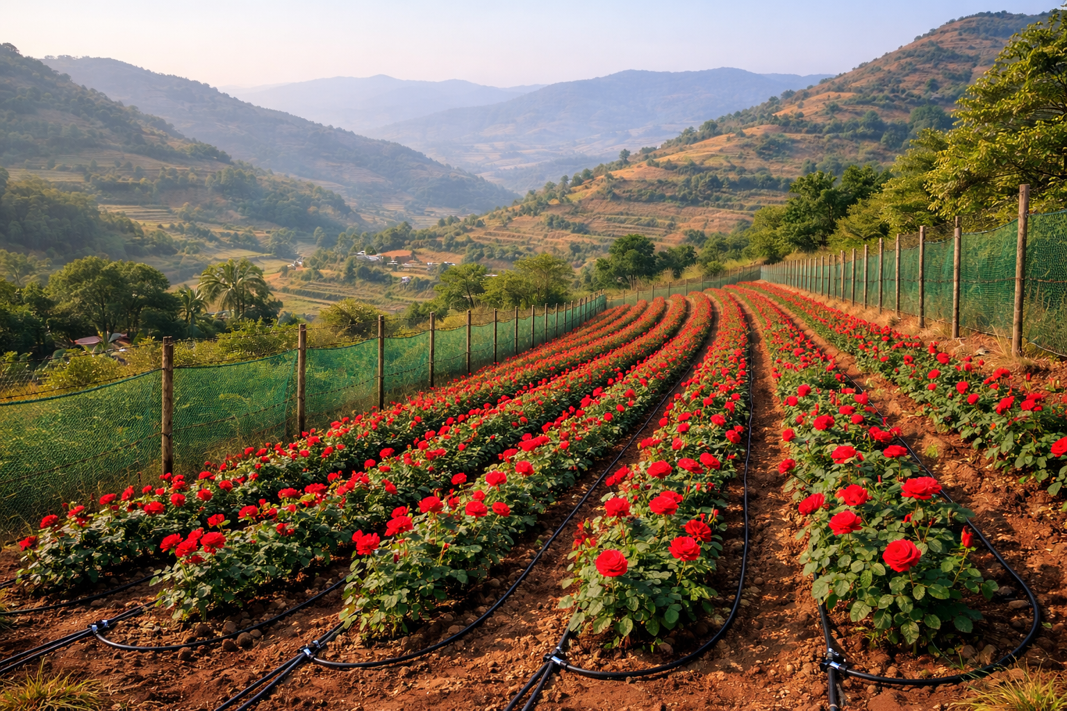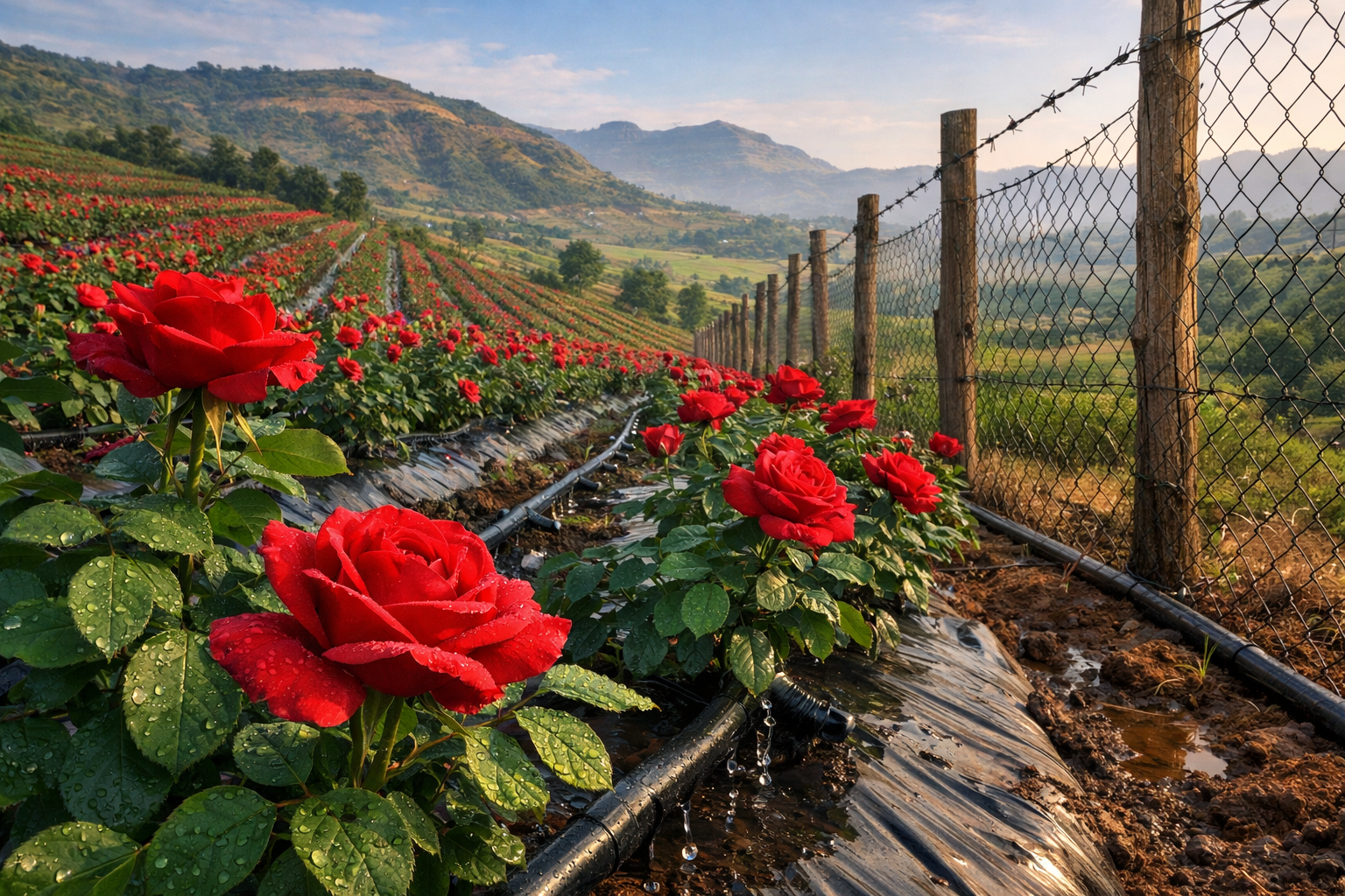A scientifically planned rose plantation ensures proper plant spacing, healthy plant development, and efficient land utilization. Drip irrigation systems deliver water directly to plant roots, improving water efficiency and supporting consistent flowering. Well-designed access pathways allow smooth farm operations, regular pruning, easy maintenance, and efficient flower harvesting.